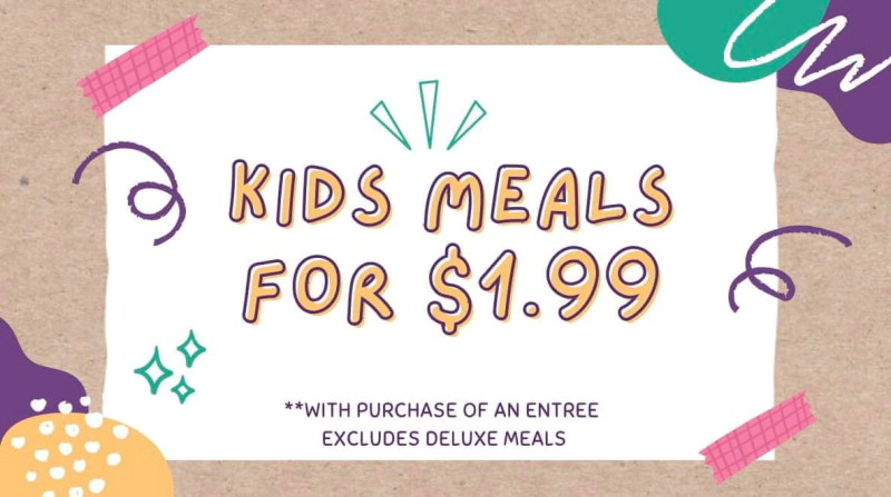SPECIALS WITH AT DRINK START AT JUST $8.25!TUESDAY TACOS ARE $1.50 & BEERS ARE $2.25!ADD A KIDS MEAL TO YOUR ENTREE FOR ONLY A $1.99
